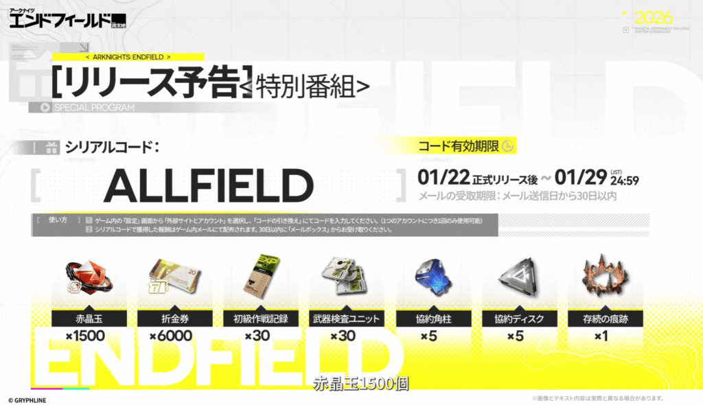 【アークナイツエンドフィールド】シリアルコード(リリース予告特別番組配布) 2026 1/16 ゲーム攻略 2026年1月16日 URLをコピーしました! アークナイツ エンドフィールド リリース予告特別番組で配布されたシリアルコードを掲載します。 RETURNOFALL ALLFIELD シリアルコードの入力方法はサービス開始後に追記いたします。 © Hypergryph,GRYPHLINE, ゲーム攻略 URLをコピーしました!