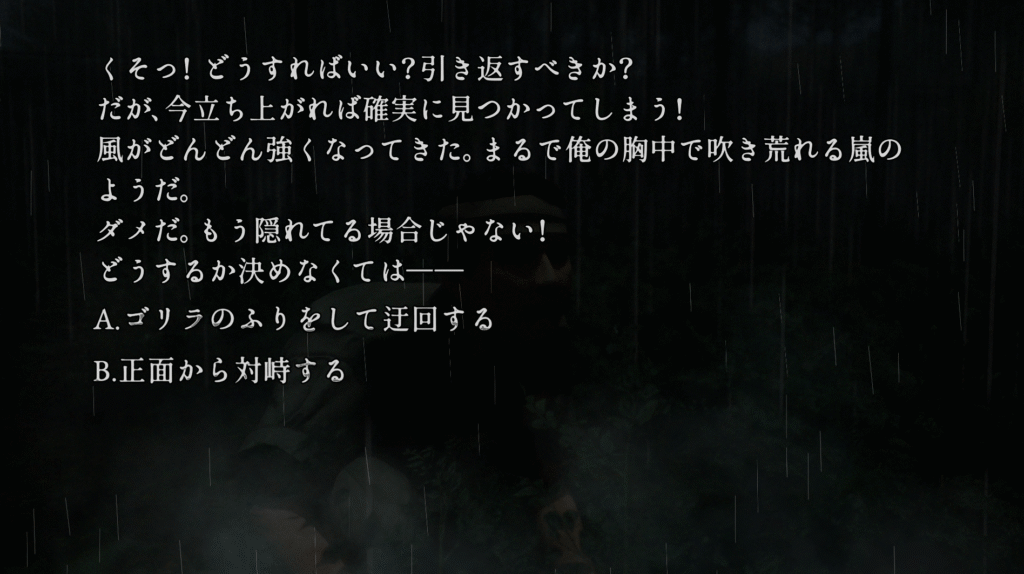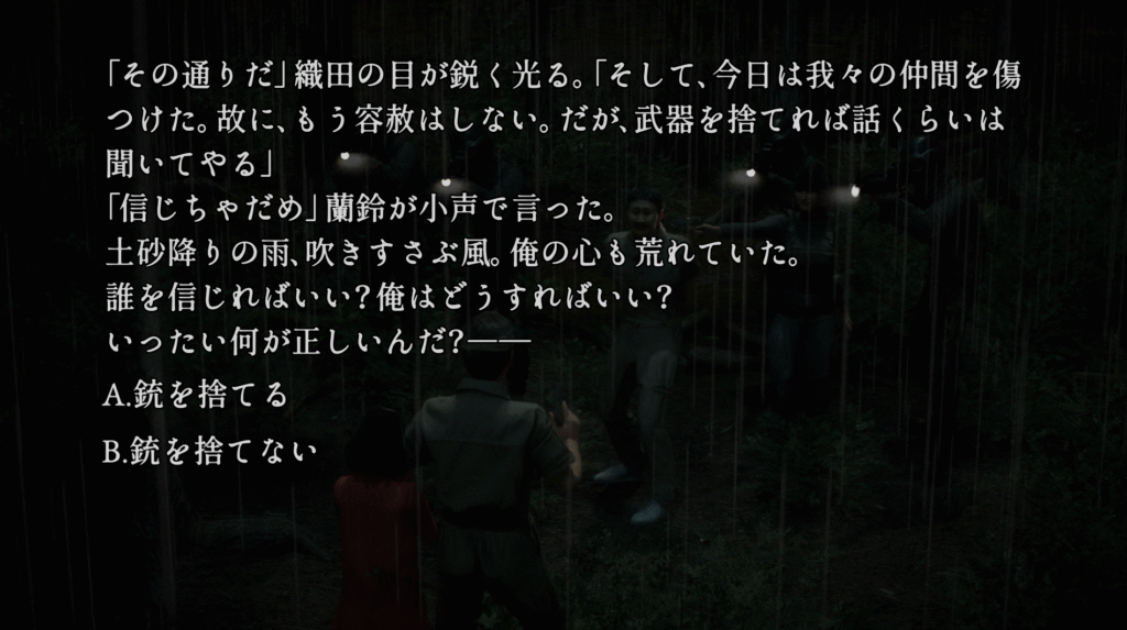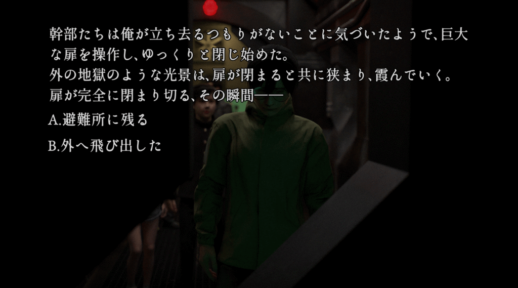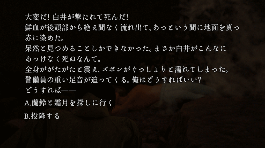 | ※「73.新たな手がかり」で心印獲得後 ①「55.雨中の分岐」で特殊監護病棟に行く ②「58.特殊監護病棟」で選択肢Bを選ぶ ③「82.銃撃戦」で銃を捨てない選択をし、エンディング「仲間を探す」を見る | |