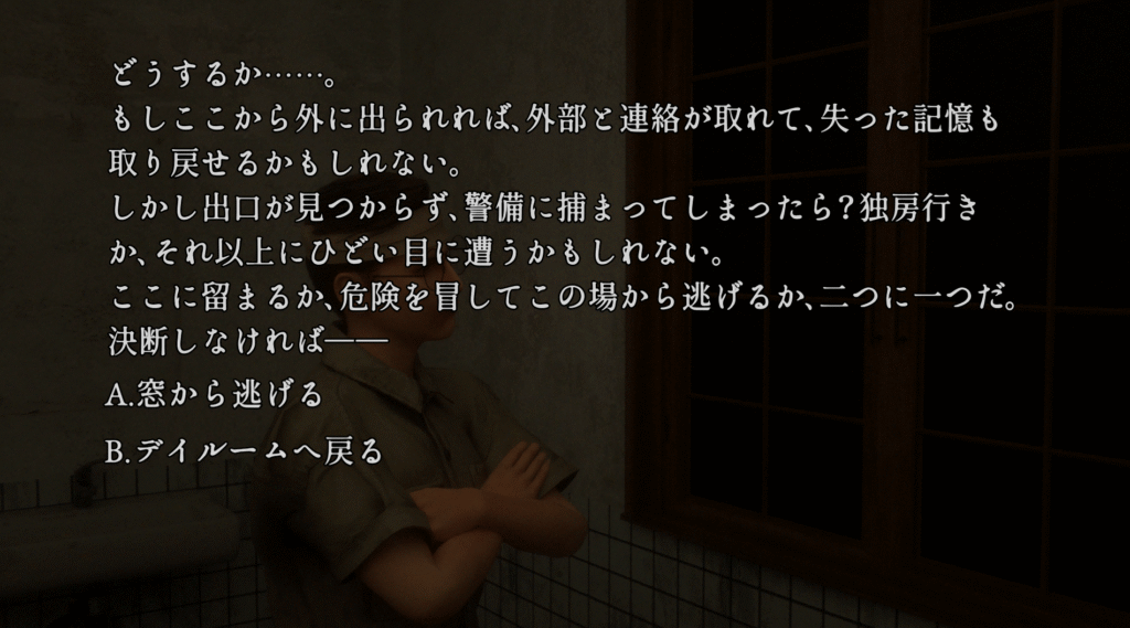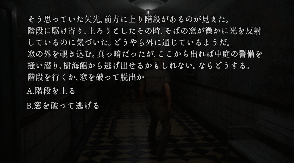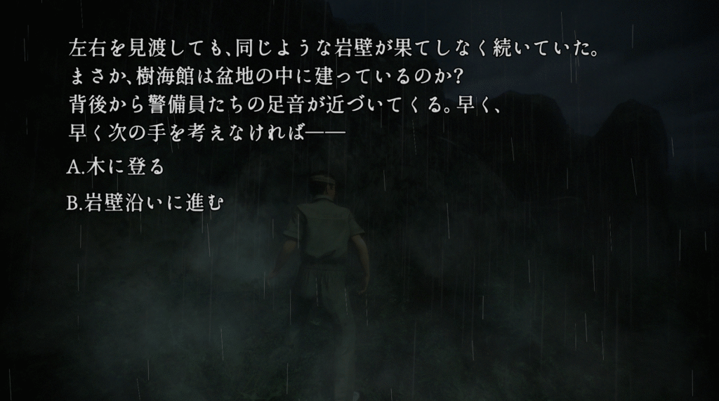 | ①「35.デイルーム」で選択肢Bを選ぶ ②「37.トイレの窓」で窓から逃げる ③「40.窓から脱走」で選択肢Bを選ぶ ④「43.雨中の格闘」で逃げる ⑤「48.森を走る」でそのまま走る ⑥「50.岩壁」で選択肢Bを選ぶ ⑦「52.洞窟」でエンディング「樹海館の出口」を見る | |