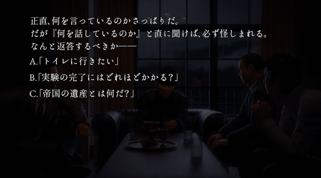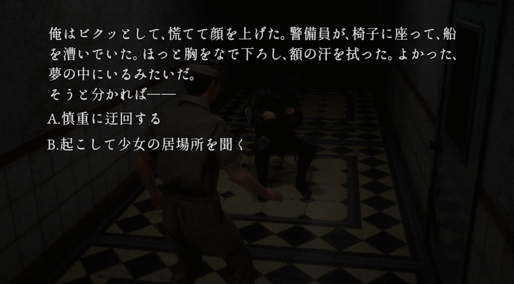 | ①「35.デイルーム」で選択肢Cを選ぶ ②「55.雨中の分岐」で研究病棟に行く ③「63.殺人事件」でモーアと協力する ④「72.推理」で選択肢Aを選ぶ ⑤「77.現実の本質」でエンディング「現実とは?」を見る | |
