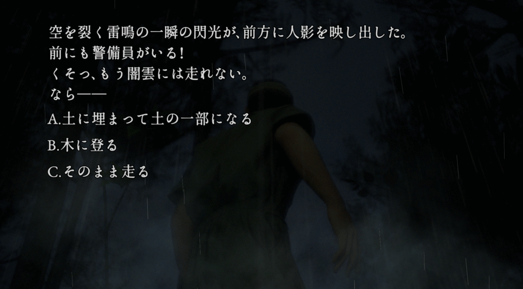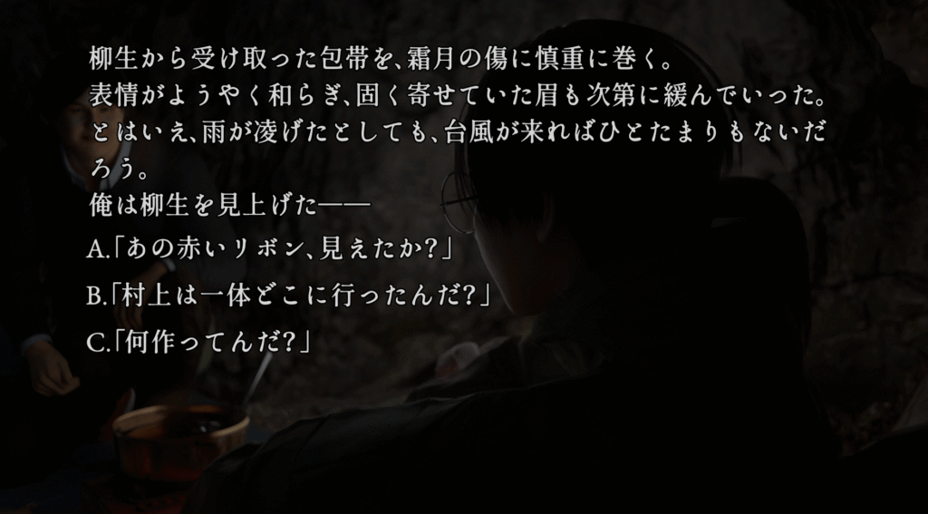 選択肢Cを選んだあと、進めていくとフォトモードが解放され、実績「緑の蝶」が解除されます。