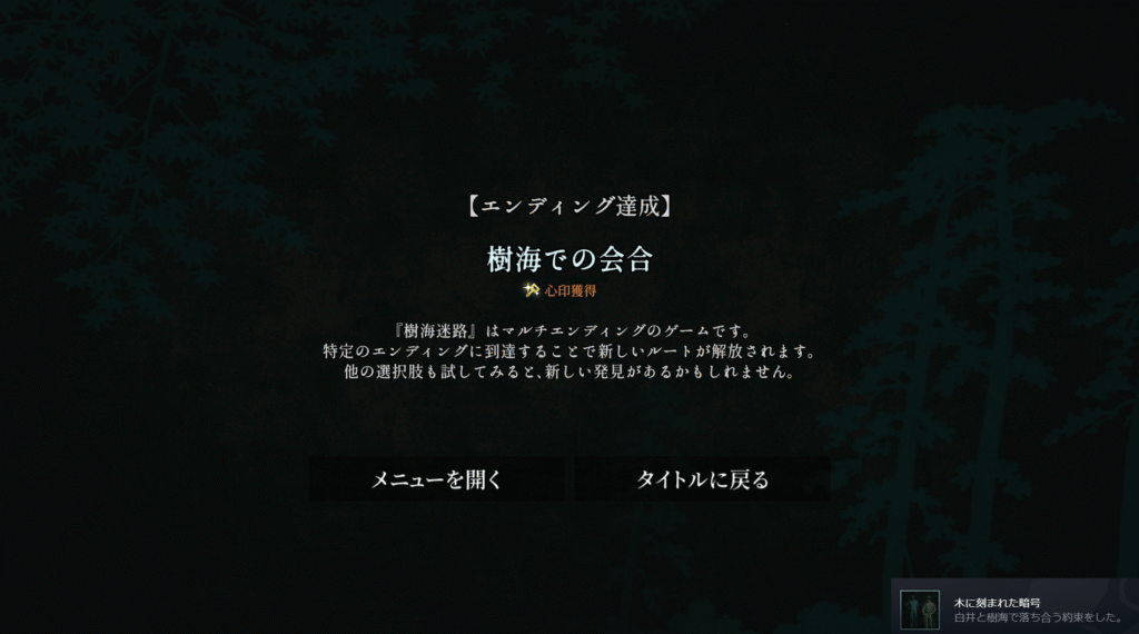 | ※「73.新たな手がかり」、エンディング「樹海館の出口」、エンディング「仲間を探す」で心印獲得後 ①「55.雨中の分岐」で病室に戻る ②「60.白井の尋問」で選択肢Bを選ぶ ③「68.協力」で選択肢Bを選ぶ ④「84.出口の在処」で選択肢Bを選ぶ ⑤「86.交渉」で重要な情報を渡す。エンディング「樹海での会合」を見る | |