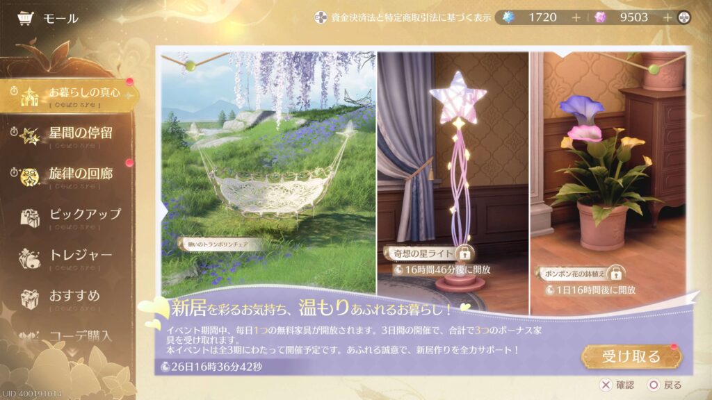 モールでも3日ログインで1日1個ずつ、合計3つの無料家具が受け取れます。