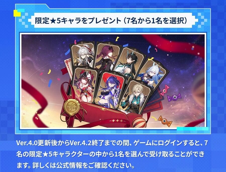 ![]() ![]() | 景元 カフカ 炭恒・飲月 鏡流 花火 黄泉 アベンチュリン | Ver.4.0~4.2 楽園のウェルカムギフト (いずれか1体を選択) |