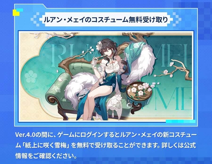 Ver.4.0終了まで、ゲームにログインすると「丹恒・騰荒(存護・物理)」1体と育成素材がもらえます。