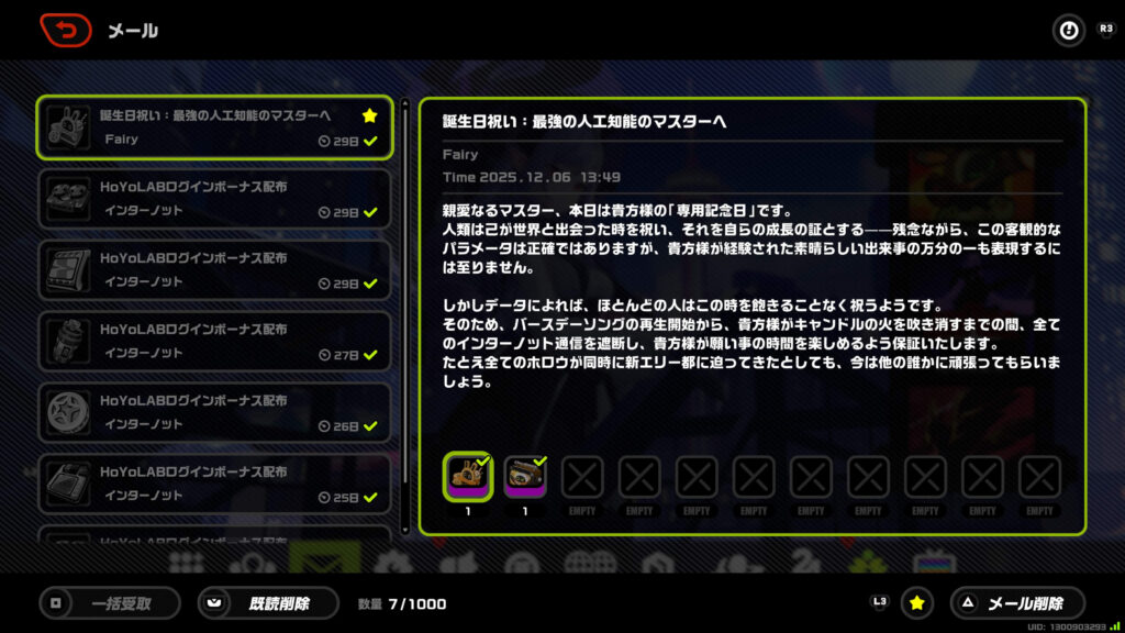 ゼンレスゾーンゼロでは、プロフィールで設定した「誕生日」当日になると、お祝いのメールが届きます。